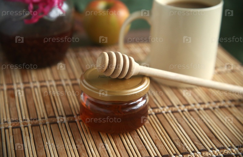 Банка меда и деревянная мешалка на бамбуковом коврике, крупный план
