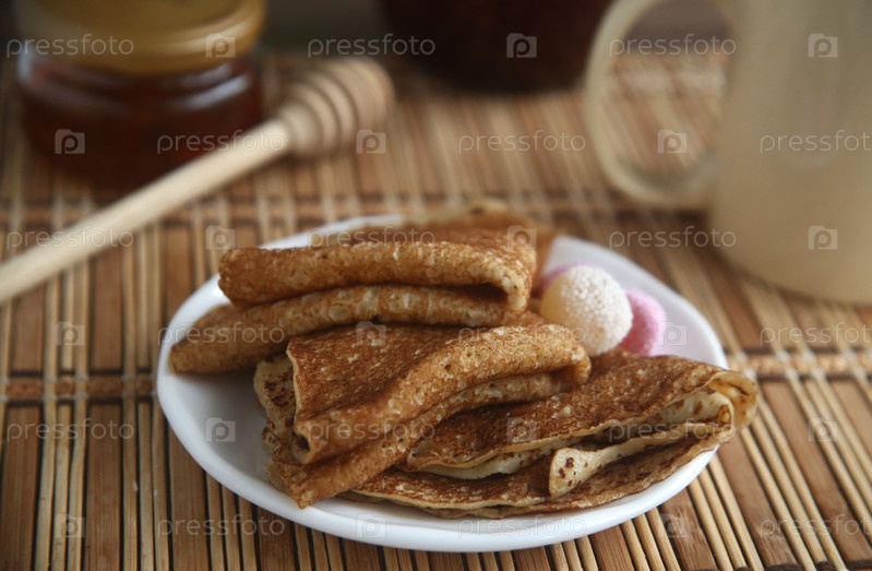 Вкусные блины, банка меда и мешалка на бамбуковом коврике, крупный план