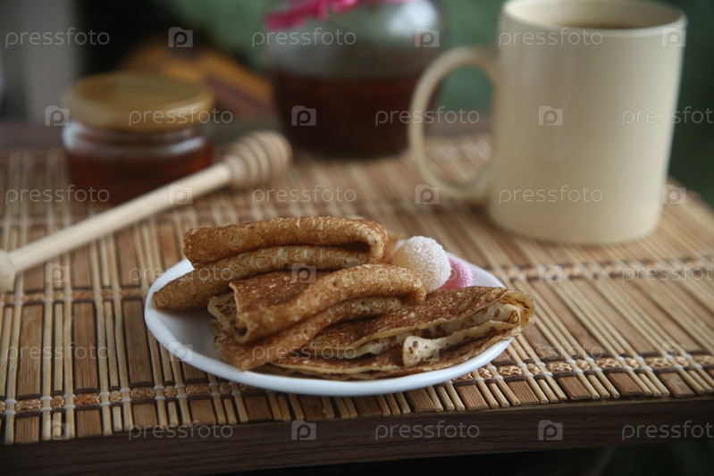 Вкусные блины, банка меда и мешалка на бамбуковом коврике, крупный план