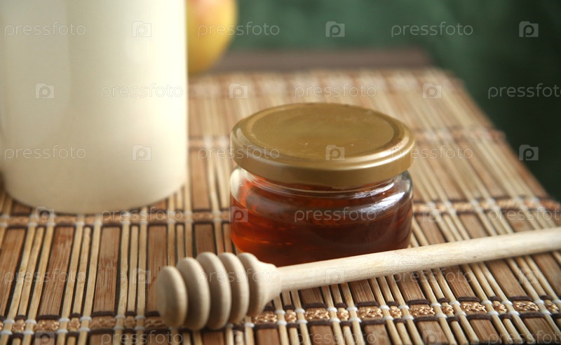 Банка меда и деревянная мешалка на бамбуковом коврике, крупный план
