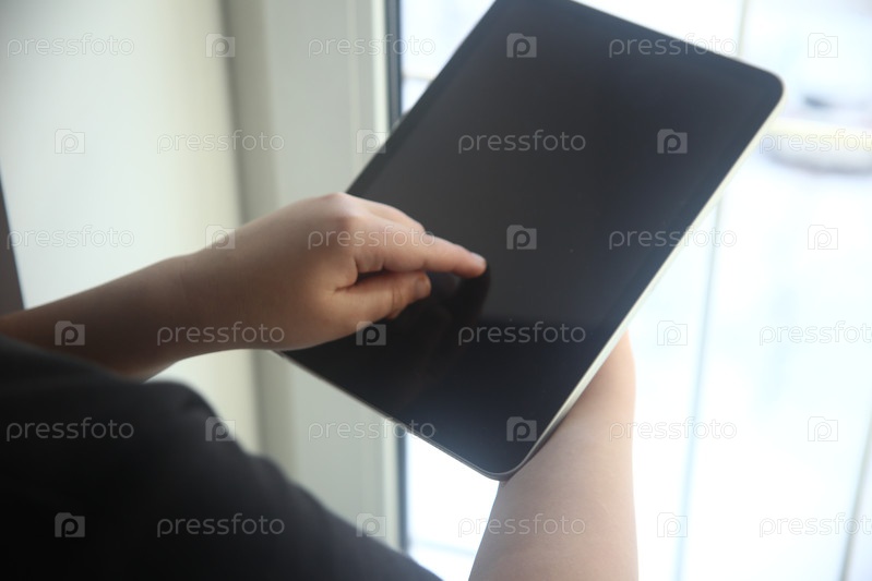Рука мальчика указывает на темный экран планшета, крупный план
