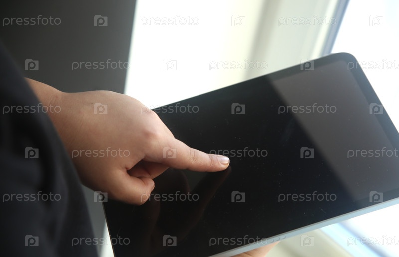 Рука мальчика указывает на темный экран планшета, крупный план