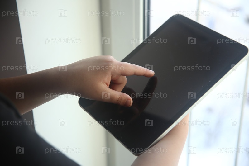 Рука мальчика указывает на темный экран планшета, крупный план