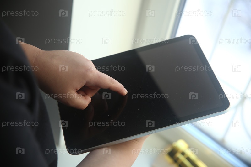 Рука мальчика указывает на темный экран планшета, крупный план