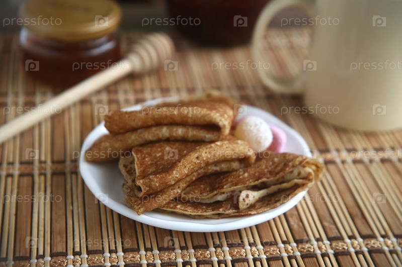 Банка меда, вкусные блины и мешалка на бамбуковом коврике, крупный план
