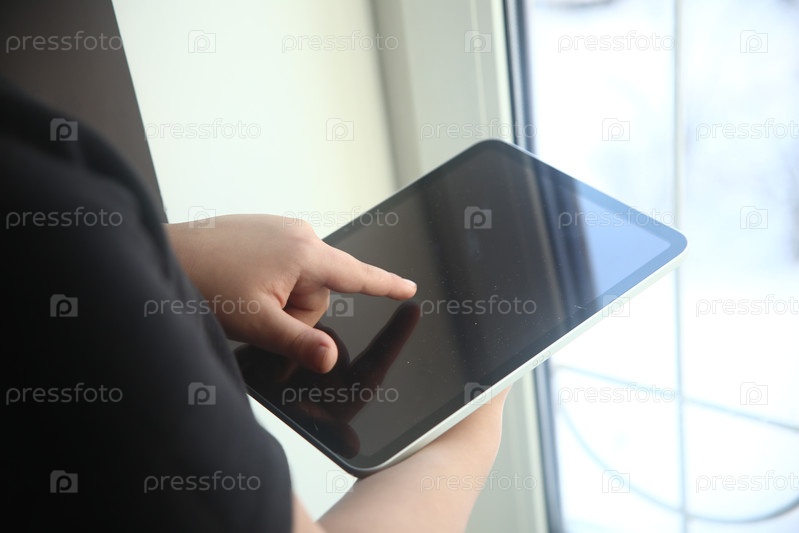 Рука мальчика указывает на темный экран планшета, крупный план