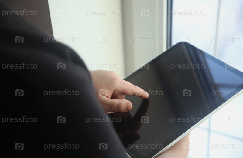 Рука мальчика указывает на темный экран планшета, крупный план