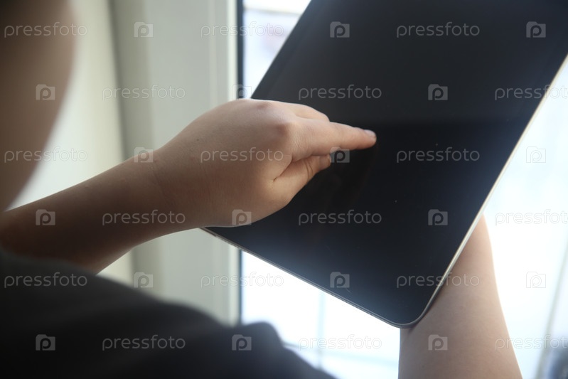 Рука мальчика указывает на темный экран в планшете, крупный план
