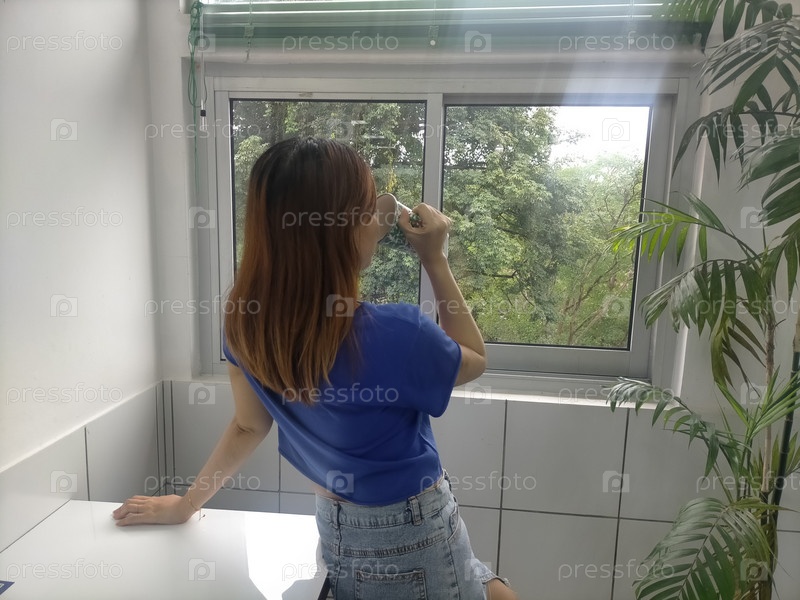 Азиатская женщина смотрит в окно и пьет из чашки