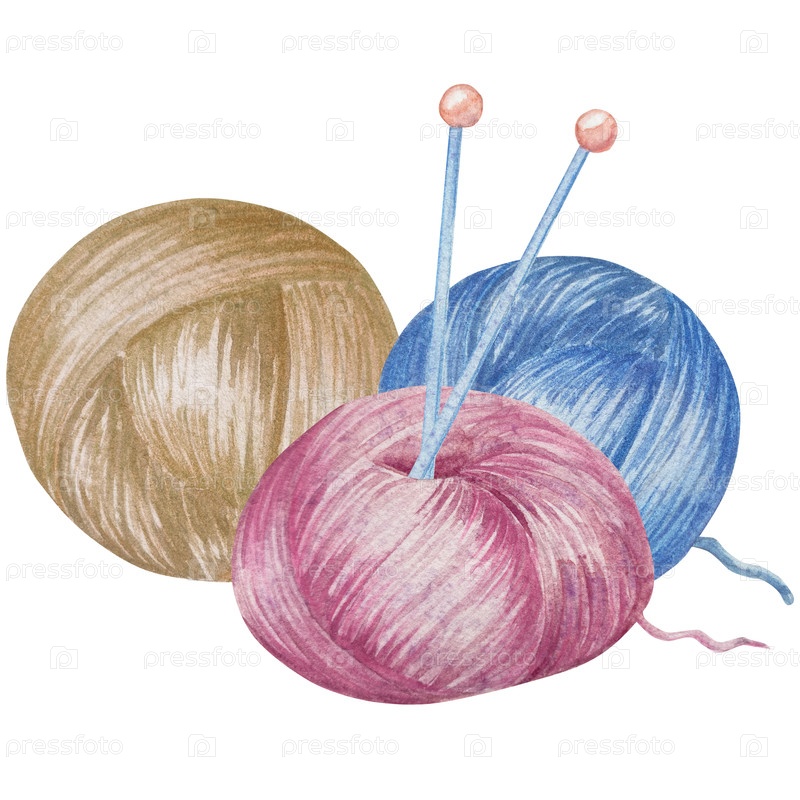 Ручно нарисованный акварельный набор вязальных и швейных элементов. шар из пряжи, вязания, нитей, ремесленных принадлежностей, шитья, вышивка. изделия ручной работы и предметы для хобби в голубом, бежевом и розовом цветах. Vintage