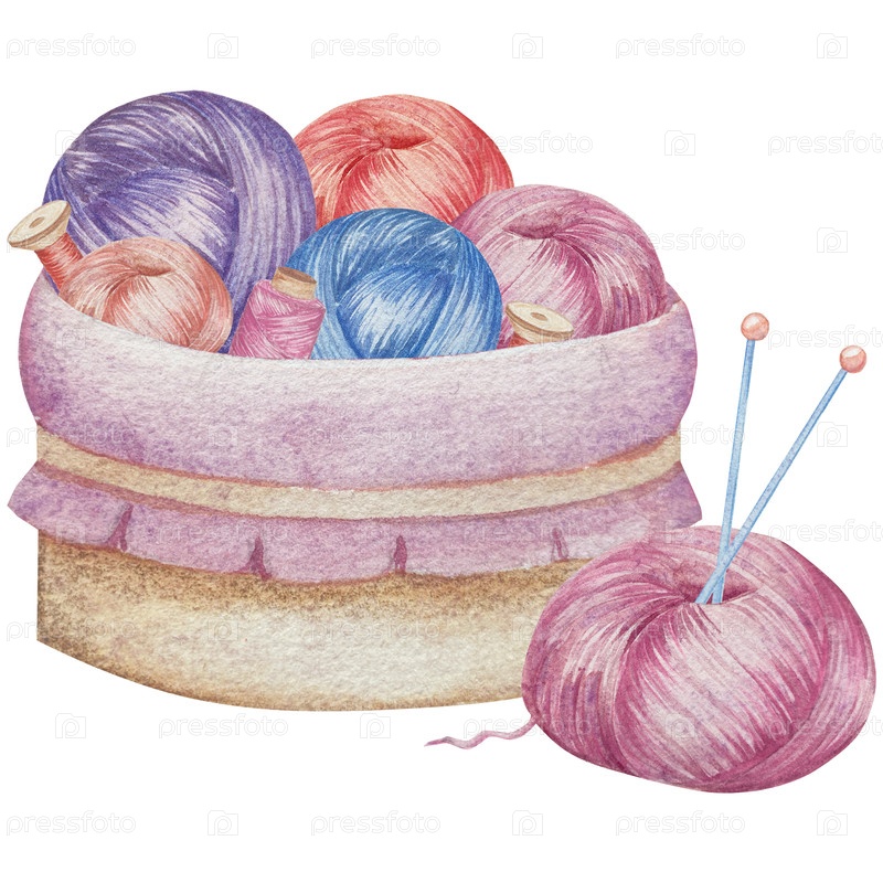 Ручно нарисованный акварельный набор вязальных и швейных элементов. шар из пряжи, вязания, нитей, ремесленных принадлежностей, шитья, вышивка. изделия ручной работы и предметы для хобби в голубом, бежевом и розовом цветах. Vintage