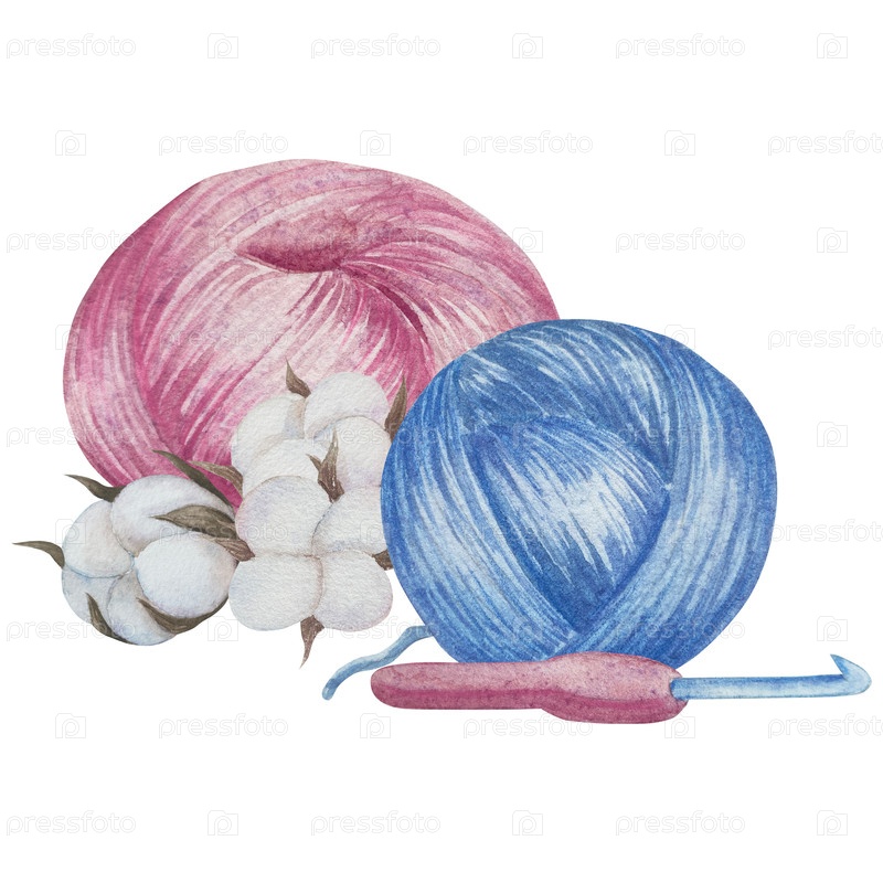 Ручно нарисованный акварельный набор вязальных и швейных элементов. шар из пряжи, вязания, нитей, ремесленных принадлежностей, шитья, вышивка. изделия ручной работы и предметы для хобби в голубом, бежевом и розовом цветах. Vintage