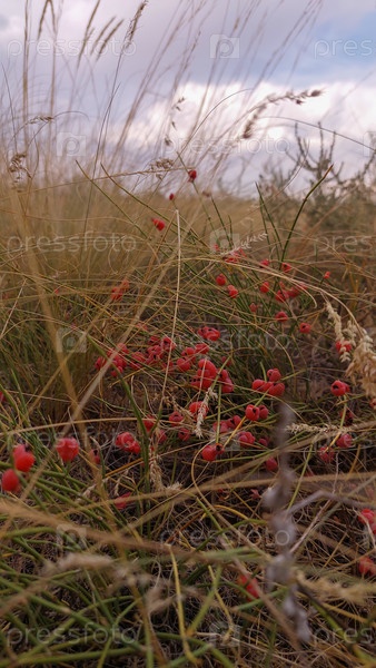 Степное поле с травой и красными ягодами