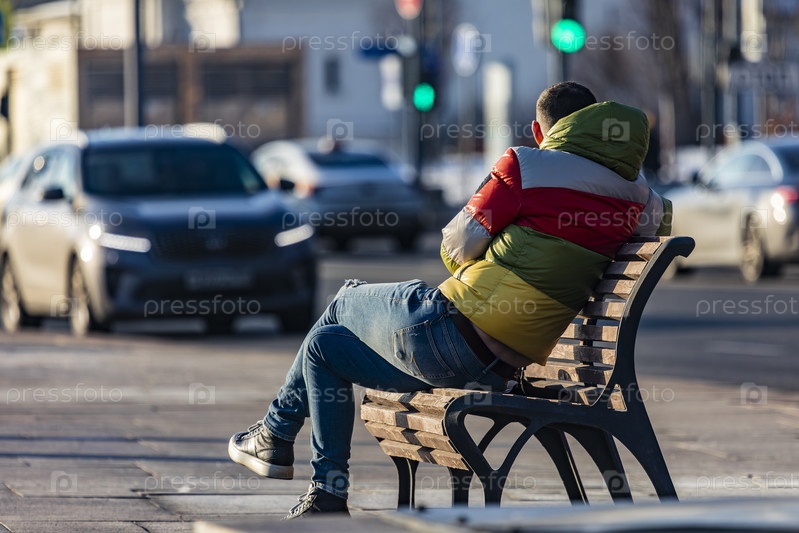 Мужчина в цветной куртке сидит на скамейке на фоне городского движения