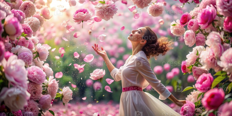 Женщина, стоящая в пионном саду с падающими лепестками