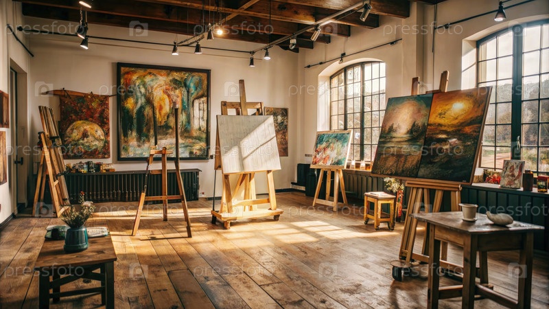 Просвеченная художественная студия с деревянными полами и несколькими ездами, демонстрирующими красочные картины