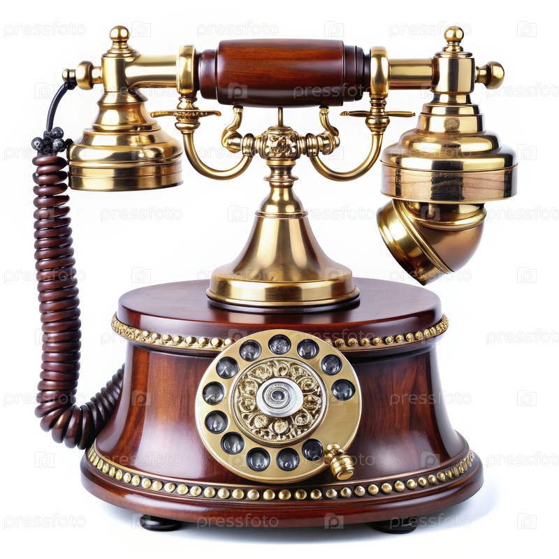 Древний латунный и деревянный ротационный телефон на белом фоне. генеративная античная ИИ