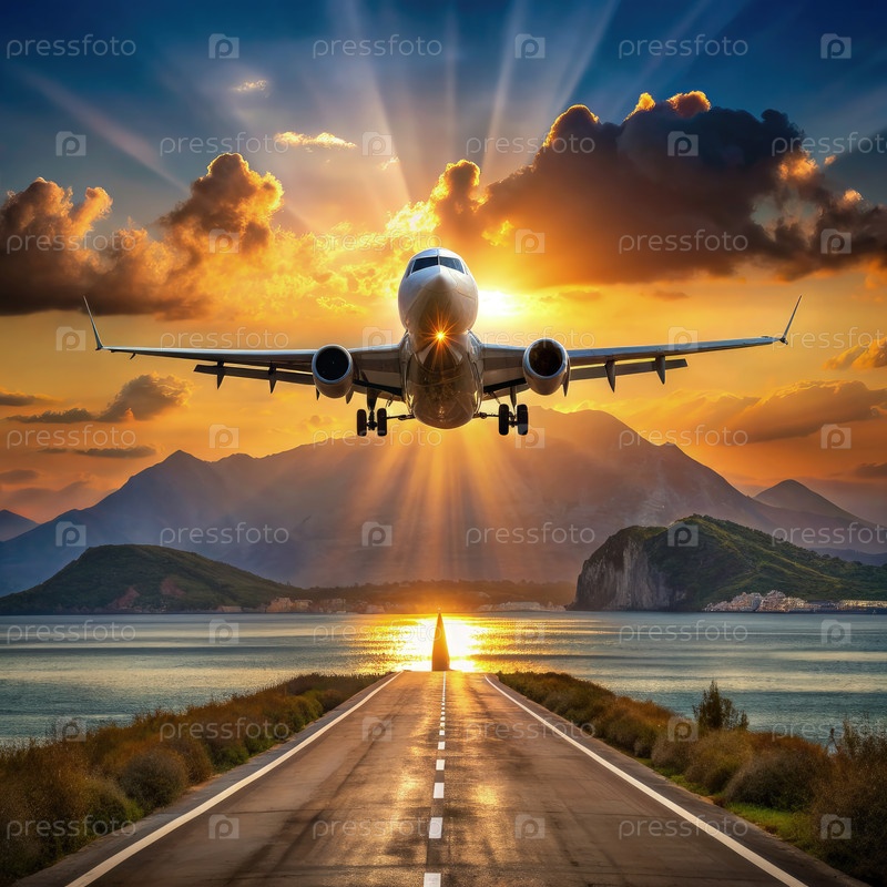Посадка самолета на взлетно-посадочной полосе во время захода солнца над горами и морем