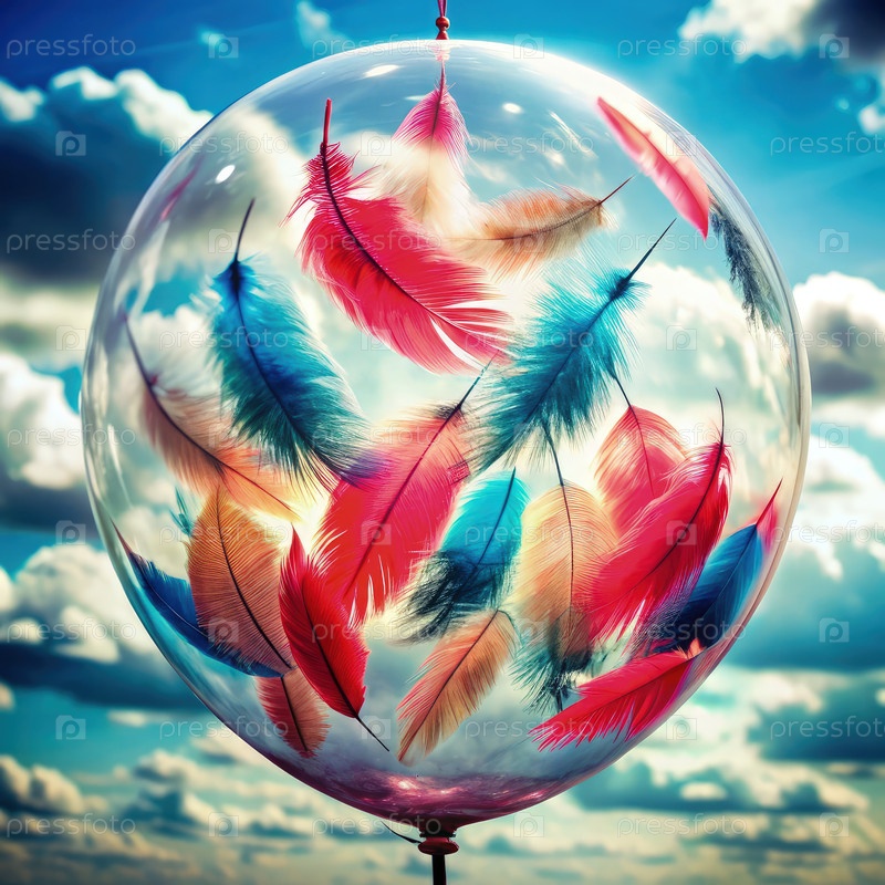 Прозрачный воздушный шар, наполненный перьями, плавающий против голубого неба
