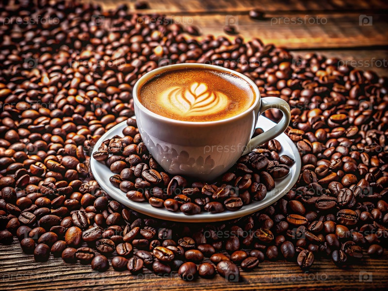 Уютная чашка кофе в окружении богатых обжаренных кофейных бобов на деревянном дереве