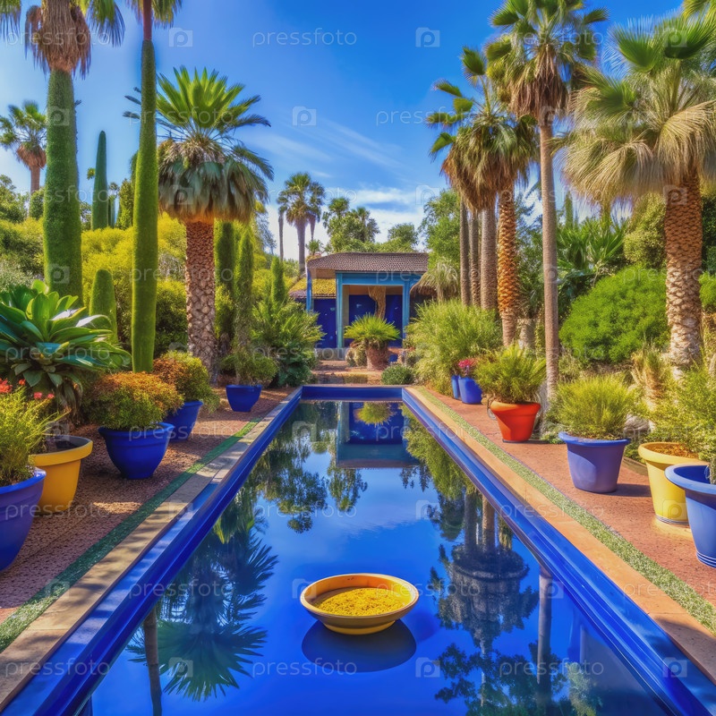 Спокойный бассейн, отражающий пальмы в саду Майорелл