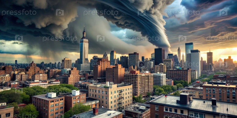 Драматические штормовые облака над горизонтом Нью-Йорка на закате