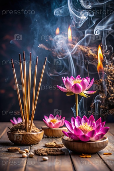 Увлекательное изображение цветов лотоса и ладан создает очаровательную ароматическую атмосферу в спокойной обстановке