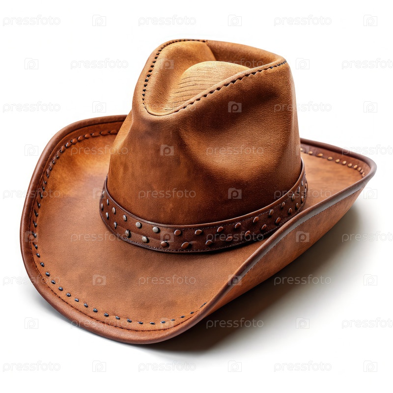 Ковбойская шляпа из коричневой кожи со сшитой кромкой и металлическими акцентами на белом фоне