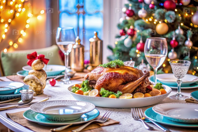 Элегантный рождественский столовый набор с жареной индейкой и праздничными украшениями в уютной обстановке