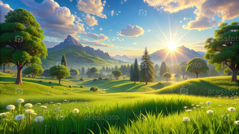 Живая зеленая луга в стиле Pixar на восходе солнца с Rolling Hills и пышными деревьями