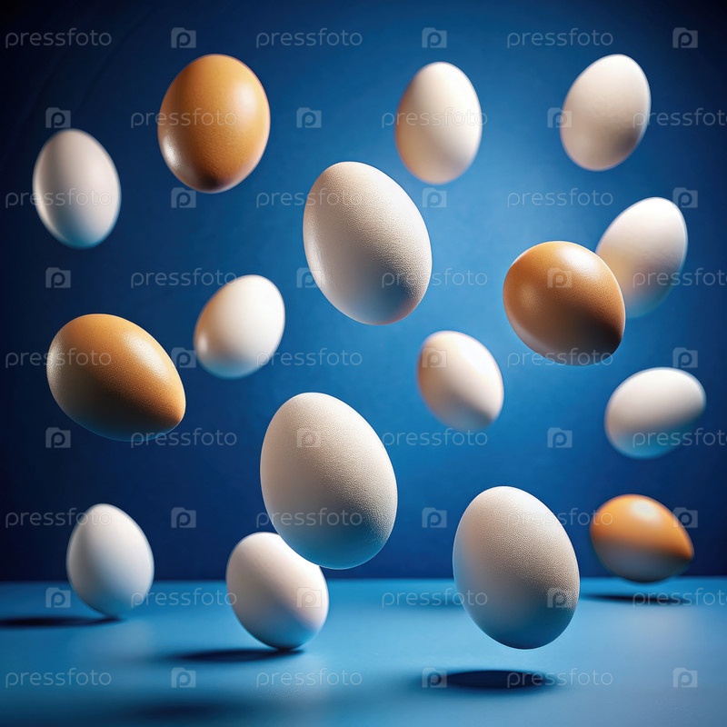 Белые и коричневые яйца плавают в воздухе на синем фоне