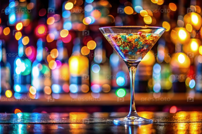 Красочное коктейльное стекло на размытом барном фоне с окружающим освещением ночью
