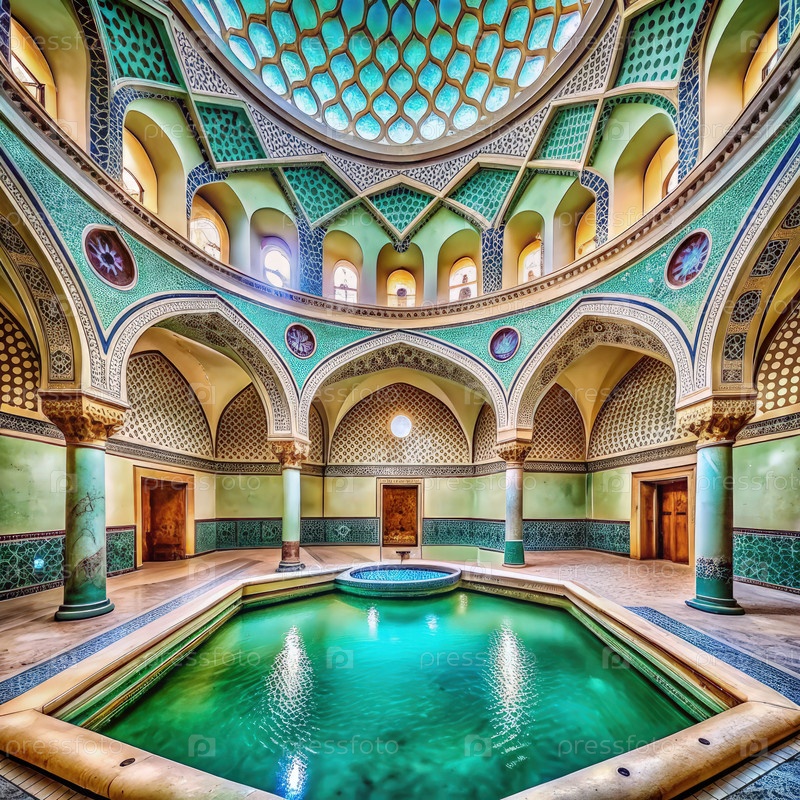 Украшенная османская баня с купольным потолком и центральным бассейном
