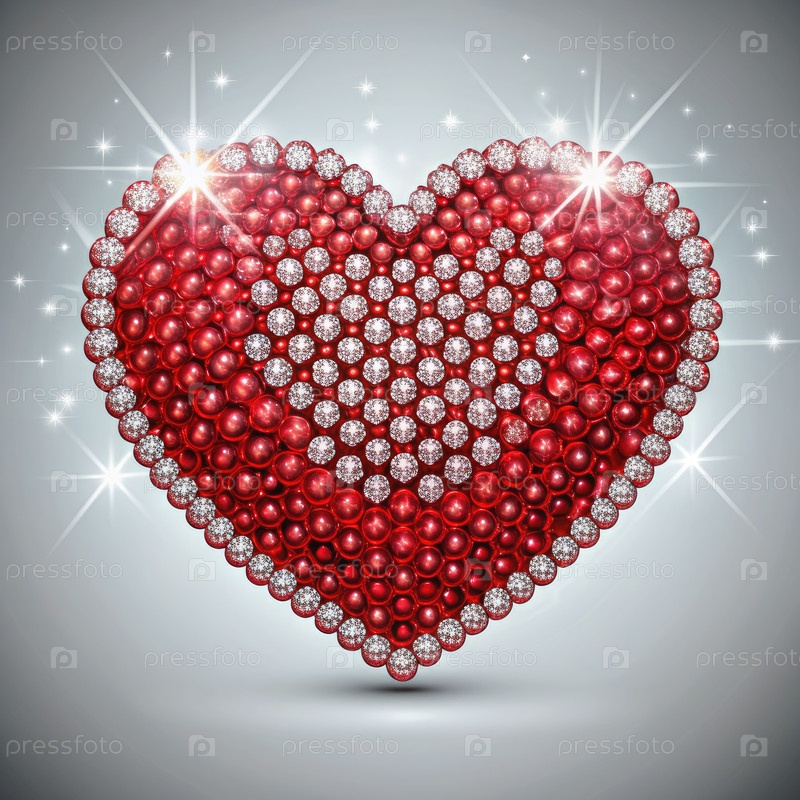 Красное алмазное сердце на светло-сером фоне со сверкающими звездами