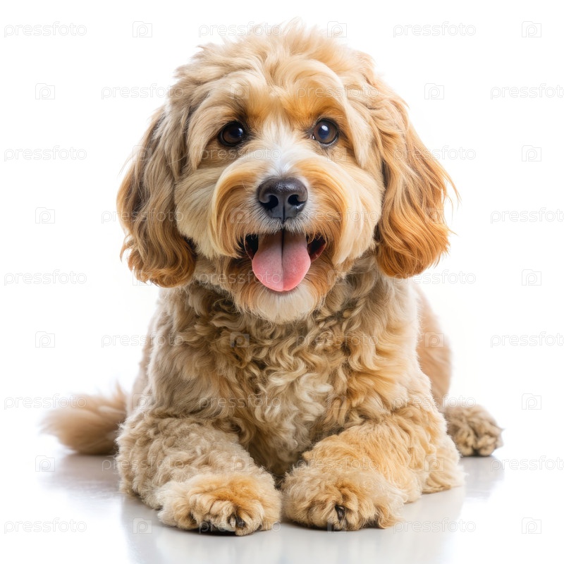 Игральная собака-коккапу, лежащая на белом фоне