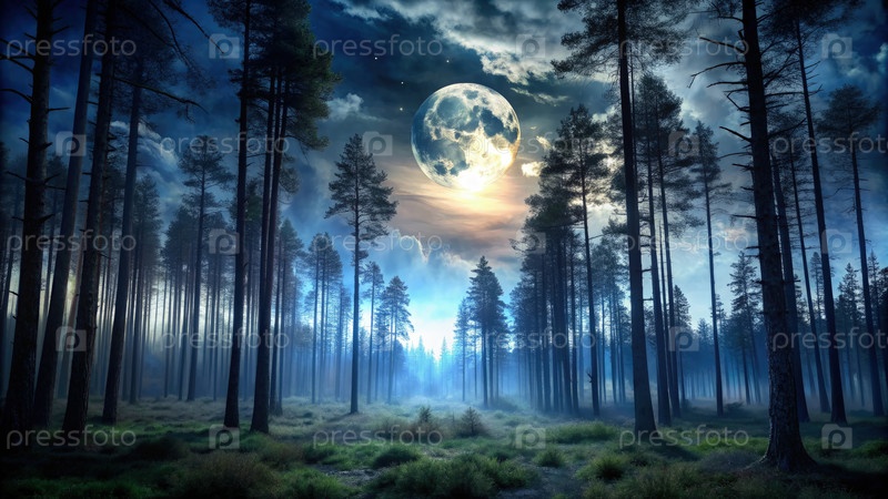 Зачарованный лес превращается в таинственное царство под полнолунием ночью