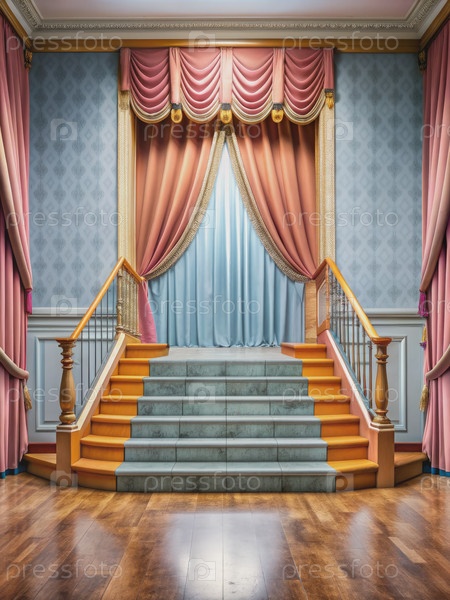 Элегантная сцена с розовыми шторами и лестницей в большом зале