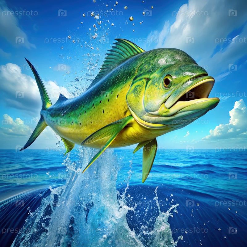 Вибрирующая Махи-махи прыгает из кристально чистых океанических вод под ярким голубым небом