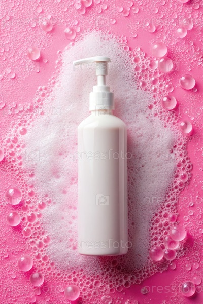 Косметическая бутылка, окруженная пузырями на розовом фоне в дневное время