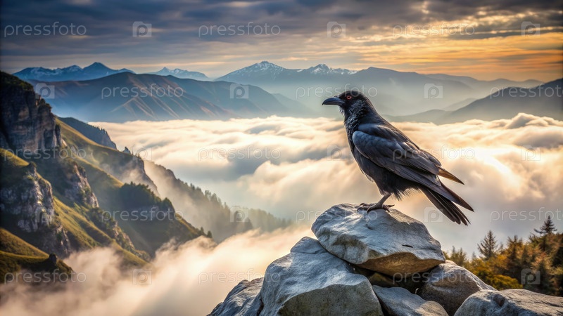Ворон, сидящий на вершине горы при восходе солнца