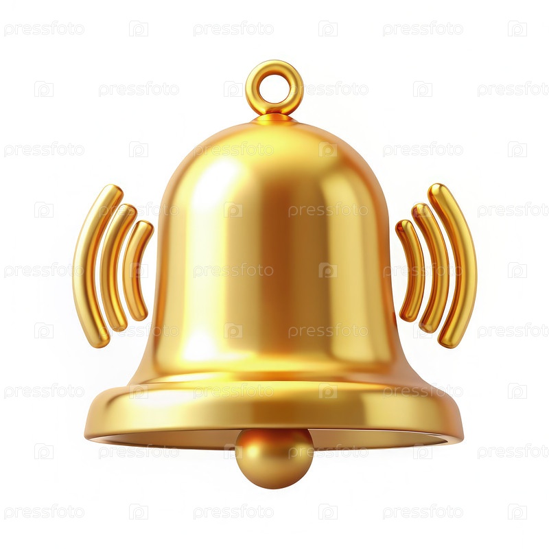 Золотой звонок оповещения излучает звуковые волны на простом белом фоне
