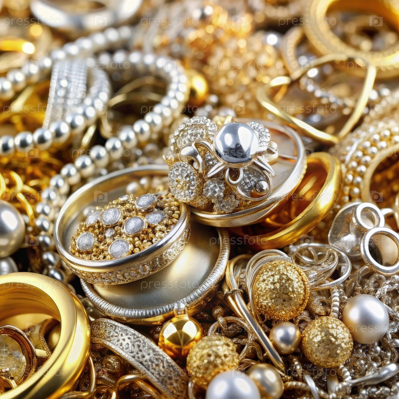 Изысканная коллекция золотых и серебряных ювелирных изделий отображается сверху со сложными дизайнами и стилями