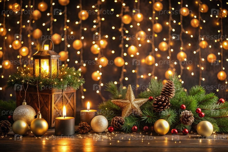 Декор для празднования Нового года с золотыми орнаментами и искрящимися огнями на темном фоне ночи
