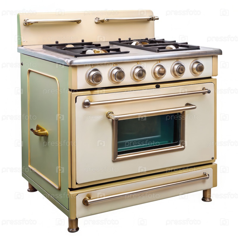 Винтажный газовый ассортимент с печью и ящиком на белом фоне