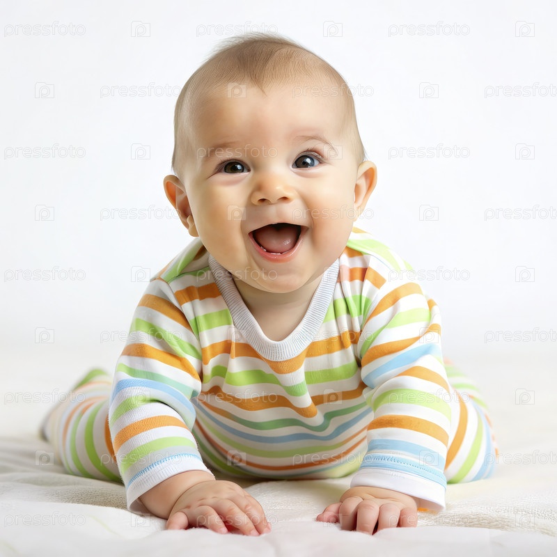 Счастливый мальчик в полосатой Онезии ползущий по белому одеялу