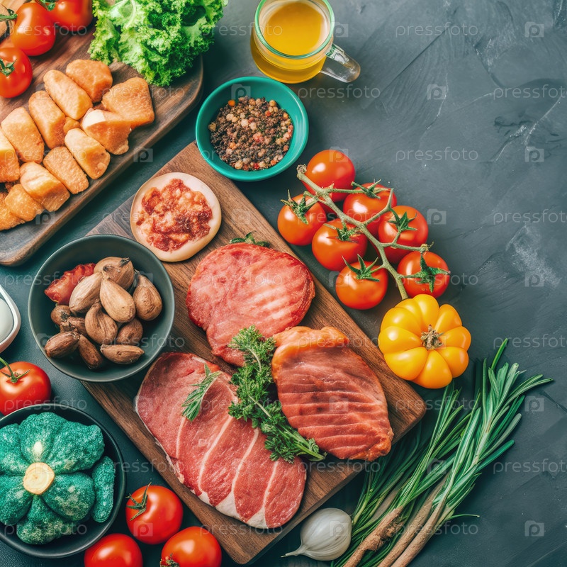 Свежие и питательные диетические продукты с избыточным мясом и красочными овощами на темном столе