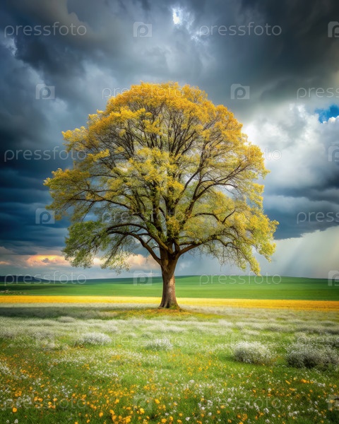 Одинокое листопадное дерево стоит в одиночестве под облачным небом на весеннем лугу