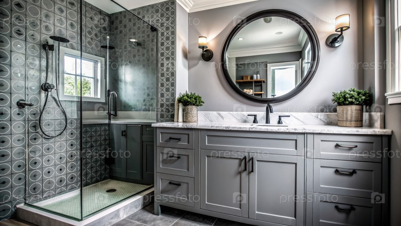 Обновленная ванная комната с серым шкафчиком и стильным дизайном душа. генеративный современный AI