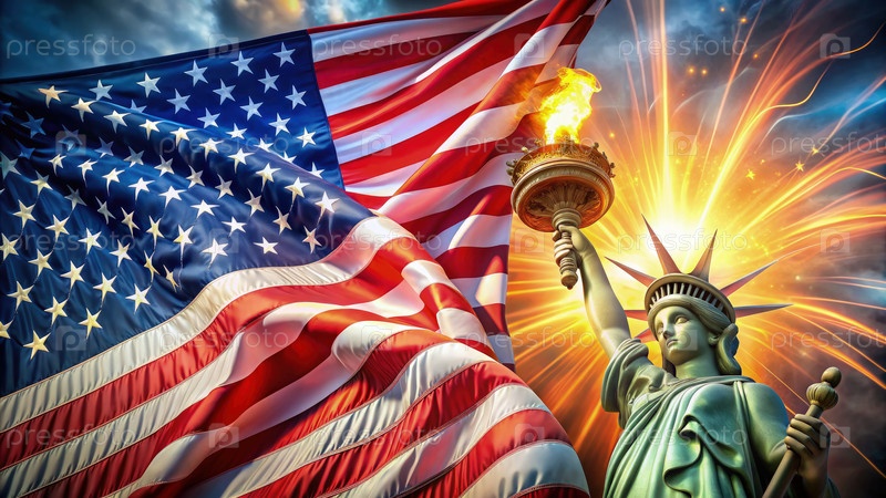 Патриотическая иллюстрация Статуи Свободы с американским флагом и фейерверком