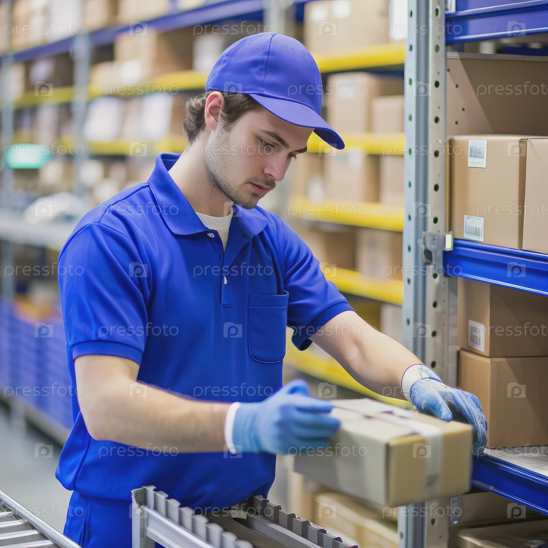 Хранилищный работник размещает пакет на полке в современном распределительном центре